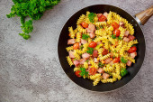 Makaron z kiełbasą i sos w ceramiczne naczynia na stół