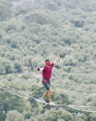 Highliner na linie. Highline na tle gór. Ekstremalny sport na łonie natury. Równowaga na temblaku. Równowaga na wysokości.