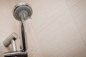 Zdjęcie w prysznicu z płynącej wody. Woda wylewa się z prysznicem, ściany ozdobione są kawy w kolorze płytek.