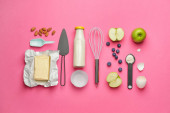 Mieszkanie leżał żywności wegetariańskiej lub wegańskiej i świeże warzywa ekologiczne drewniane sztućce w miejscu ustawienia gotowy na lekki lunch na różowym tle