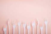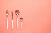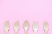 Mieszkanie świeckich różnych zrównoważonych i przyjaznych, drewniane sztućce, nóż, widelec i łyżka z kopia miejsce na różowym tle