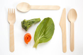 Mieszkanie świeckich różnych zrównoważonych i przyjaznych, drewniane sztućce, nóż, widelec i łyżka z zdrowej żywności wegetariańskiej lub wegańskiej na różowym tle
