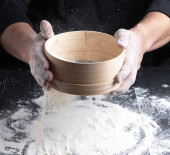 człowiek przesiewa białą mąkę pszenną przez sito drewniane, czarne tło