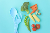 A flat lay of a light lunch consisting of fresh vegetables and vegan or vegetarian food such as broccoli and carrots with environmentally friendly wooden cutlery in a place setting ready for lunch on a white background