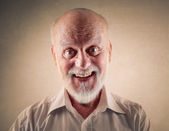 Zamyślony starszy mężczyzna pozowanie ręką na podbródek, on jest myślenie i uśmiechając się