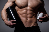 Doping, anaboliczne, białka, steryd, sport witaminy, kulturysta i kulturystyki. Mięśni, silne, muskularne. «««Diety, fitness. Człowiek z mięśni ciała trzymać słoik pigułki, sport. Sportowca trzymać diety pill.