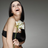 portret seksualne brunetka z różowym storczyki w włosy. emocje, kosmetyki