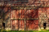 Red malowane drzwi na vintage stodoła w wiejskich Midwest.