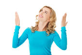szczęśliwi, podekscytowani, młoda kobieta, wskazując na miejsce