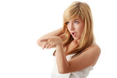 szczęśliwi, podekscytowani, młoda kobieta, wskazując na miejsce