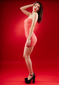 piękna brunetka stojący z rękami na biodrach na czerwonym tle