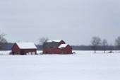 Obrazu starych drewnianych spichlerzy rolnych w mroźny zimowy poranek.
