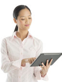 biznes kobieta gospodarstwa tabletki z panelem dotykowym.