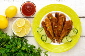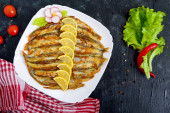 Zdjęcie "Fried gromadnika z cytryny na płytce białe na czarnym tle drewnianych. Danie z ryb morskich małe. Z bliska" może być wykorzystywane do celów osobistych i komercyjnych zgodnie z warunkami zakupionej licencji Royalty-free. Obraz jest dostępny do pobrania w jakości wysokiej rozdzielczości do 5760x3840.