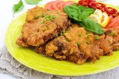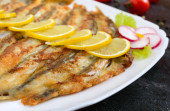 Fried gromadnika z cytryny na płytce białe na czarnym tle drewnianych. Danie z ryb morskich małe. Z bliska