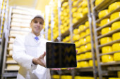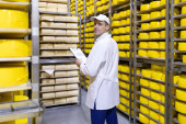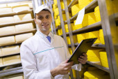 Inspektor sprawia, że notatki w arkuszu w magazynie ser