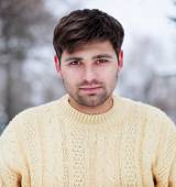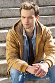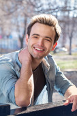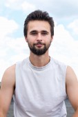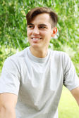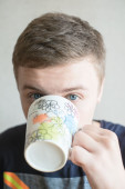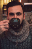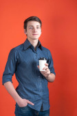 młody przystojny mężczyzna pije kawę z białego kubka