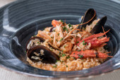 Napowietrznych zdjęcie risotto z owocami morza na tekstury, teal, widelec i łyżka, kieliszek białego wina i miejsce dla tekstu