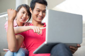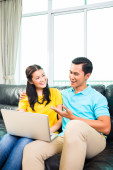 Szczęśliwa Młoda para rasy mieszanej z laptopa siedząc na kanapie i zakupy online