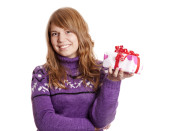Piękna młoda dziewczyna z fioletowymi włosami w kurtce z pudełka wakacje na białym tle.