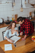 zazdrosny emocjonalne człowiek ogląda uśmiechający się młoda żona w domu, przy użyciu smartfona koncepcja nieufności