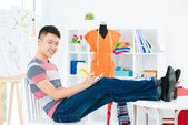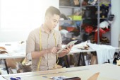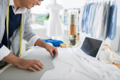 Koncentruje się młody mężczyzna krawiec pracę w miejscu jego pracy, on materiał cięcia nożyczkami