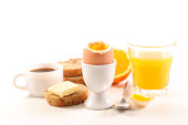 śniadanie z jajkiem, sok pomarańczowy i filiżanka kawy