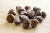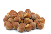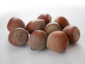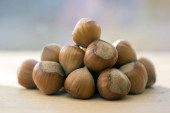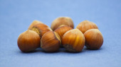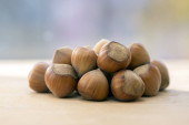 Corylus avellana nakrętki na drewnianym stole, Grupa wspólne orzechy laskowe w muszli