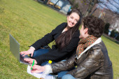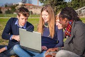 Grupa nastoletnich uczniów w parku z komputera i książek