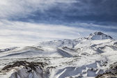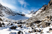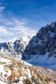 Szczyt góry pod śniegiem i niebieskie niebo. Wspinaczki skały, alipinism. Zimowa panorama wąwozu górskich Ałtaju.