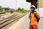 Twarz człowieka Afryki turystyczne, uśmiechając się i czeka na pociąg