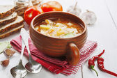 Tradycyjne kapuśniak rosyjski Shchi w misce na rustykalne drewniane tła. Selektywny fokus.