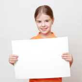 uśmiechający się dziewczynka gospodarstwa, białe karty dla Ciebie przykładowy tekst