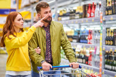 Młoda para w supermarkecie, wakacje, zakupy. Płci męskiej i żeńskiej klientów kupujących alkohol. Mężczyzna i Kobieta, zakup napojów