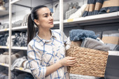 Zdjęcie "Młoda kobieta, zakup ręczniki w supermarkecie. Kobiece klienta na zakupy w hipermarket, departamencie towarów dla domu" może być wykorzystywane do celów osobistych i komercyjnych zgodnie z warunkami zakupionej licencji Royalty-free. Obraz jest dostępny do pobrania w jakości wysokiej rozdzielczości do 5760x3840.