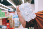 Młody człowiek zakup wody mineralnej w supermarkecie. Mężczyzna klienta na zakupy w hipermarkecie, napoje w departamencie