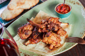 Grillowane kawałki mięsa na drewnianej płycie z cebulą i sosem i kieliszkami czerwonego wina