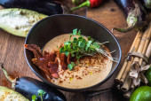 Tajska Zupa krem z owoców morza i warzyw w misce na drewnianym stole ze składników