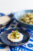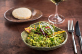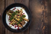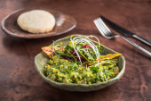 Przekąska warzywna w płaskim chlebie serwowana na talerzu z listwami cytrynowymi i sałaty