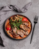 Mięso, grzyby i gulasz warzywny na patelni na lnianej obrus