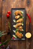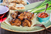 Grillowany Kebab na drewnianej płycie z cebulą i chlebem płaskim, kieliszek czerwonego wina