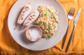 wieprzowe smażone plastry i posiekaną kapustą pieczone na rustykalne płytki na drewnianym stole