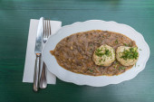 W domu puree ziemniaczane i smażone mięso i pieczarki z sosem na Wzorzysty talerz na drewnianym stole