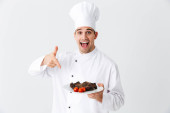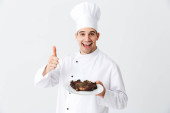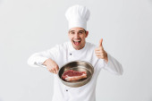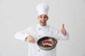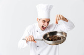 Wesoły kucharz noszenia jednolitego wyświetlone patelnia z gotowanych befsztyk na białym tle nad białym tle, przyprawy