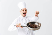 Zdjęcie "Wesoły kucharz noszenia jednolitego wyświetlone patelnia z gotowanych befsztyk na białym tle nad białym tle, przyprawy" może być wykorzystywane do celów osobistych i komercyjnych zgodnie z warunkami zakupionej licencji Royalty-free. Obraz jest dostępny do pobrania w jakości wysokiej rozdzielczości do 5760x3840.