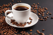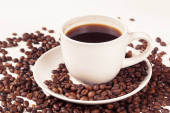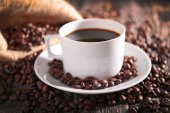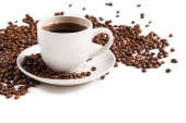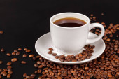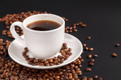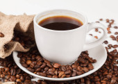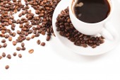 Filiżanki kawy w palonych ziaren kawy na białym tle, na białym tle.