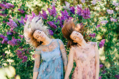 piękne młode Bliźniaczki w różnych sukienki w kwitnący lato ogród botaniczny