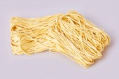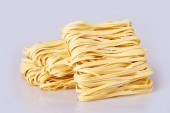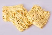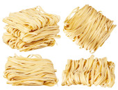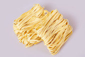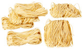 Suchy gruby walcowane makaron kwadratowy kształt. Capelli d'angelo, włosy anioła - makaron. Włoskiego makaronu tagliatelle. Dania kuchni włoskiej. Makaron jajeczny. Na białym tle