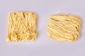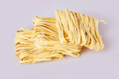 Zdjęcie "Suchy gruby walcowane makaron kwadratowy kształt. Capelli d'angelo, włosy anioła - makaron. Włoskiego makaronu tagliatelle. Dania kuchni włoskiej. Makaron jajeczny. Na białym tle" może być wykorzystywane do celów osobistych i komercyjnych zgodnie z warunkami zakupionej licencji Royalty-free. Obraz jest dostępny do pobrania w jakości wysokiej rozdzielczości do 5760x3840.