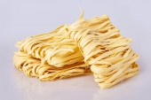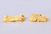 Suche cienki makaron walcowany kwadratowy kształt. Capelli d'angelo, włosy anioła - makaron. Włoskiego makaronu tagliatelle. Dania kuchni włoskiej. Makaron jajeczny. Makaron tagliatelle zagnieździć na białym tle na białym tle